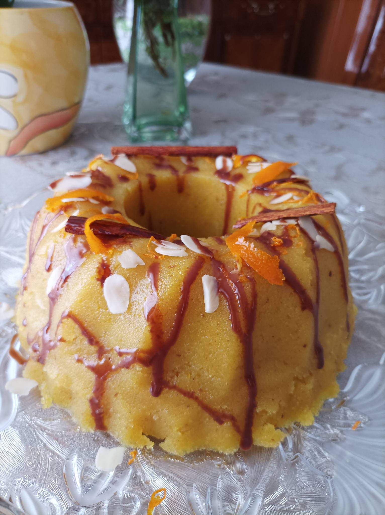 - Βράζουμε το σιρόπι. Όταν είναι έτοιμο, το ρίχνουμε πάνω από το σιμιγδάλι και ρίχνουμε και την ινδική καρύδα αλλά και το ξύσμα πορτοκαλιού