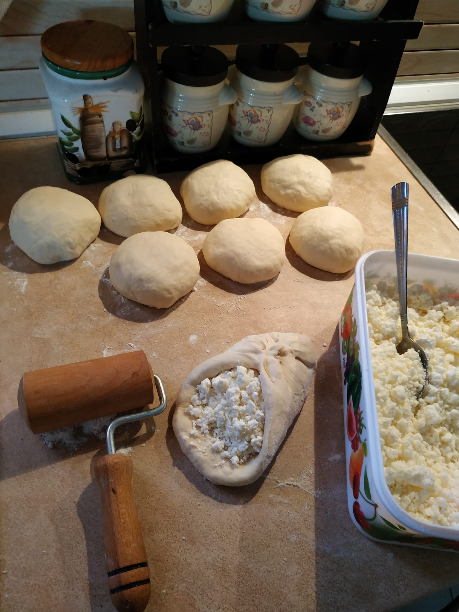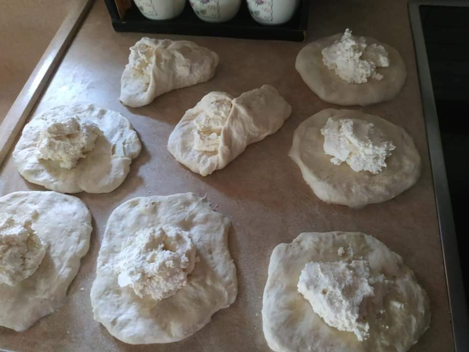 - Ανοίγουμε κομμάτια ζύμης στο μέγεθος του τηγανιού μας και βάζουμε στη μέση τη γέμιση. Μαζεύουμε σε πουγκί και ξανά ανοίγουμε τη ζύμη μας. Προκύπτουν περίπου 8 κομμάτια