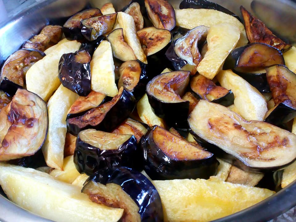 - Κόβουμε τις πατάτες σε χοντρές φέτες και τις τηγανίζουμε σε μπόλικο ελαιόλαδο, χωρίς να ψηθούν εντελώς.