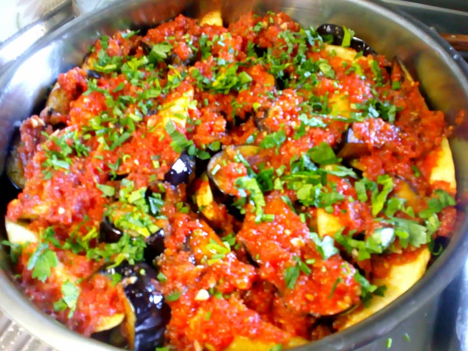 - Όταν όλα είναι έτοιμα, τα στρώνουμε σε ένα σκεύος και περιχύνουμε με τη σάλτσα τομάτας. Πασπαλίζουμε με λίγο ψιλοκομμένο μαϊντανό