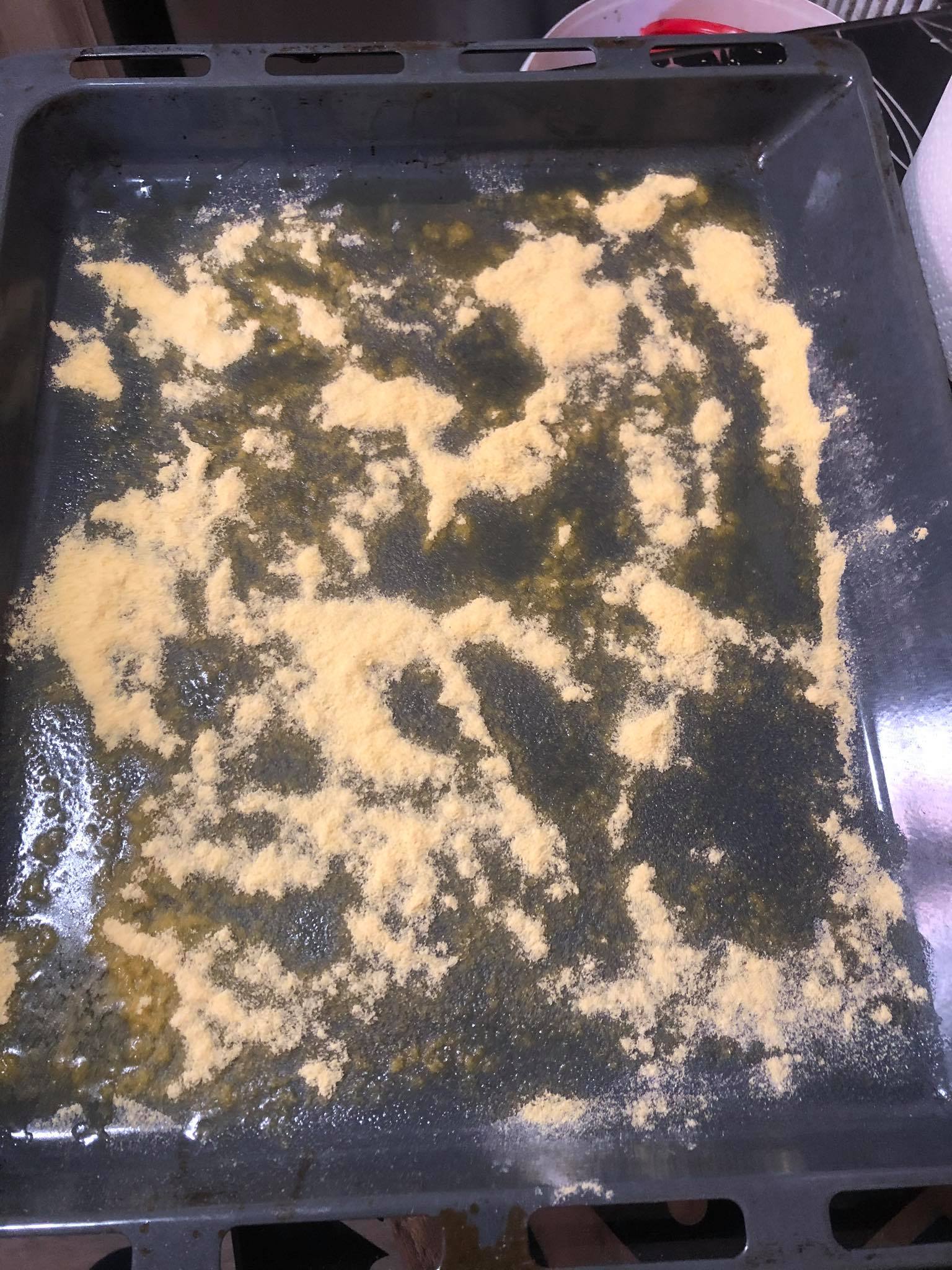 • Από πάνω από το λάδι, ρίχνω βροχηδόν καλαμποκάλευρο να πιάσει όλη την επιφάνεια