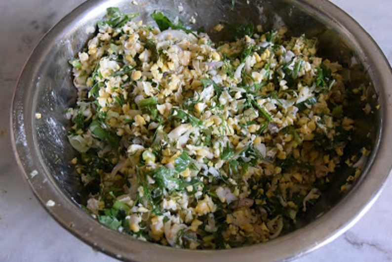 - Προσθέτουμε και όλα τα υπόλοιπα μυρωδικά, όλα ψιλοκομμένα με το χέρι γιατί δίνουν άλλη γεύση. Προσθέτουμε και αλάτι, πιπέρι, το μπέικιν πάουντερ και 2 κουταλιές σούπας λάδι. Ανακατεύουμε πολύ καλά, με ένα κουτάλι