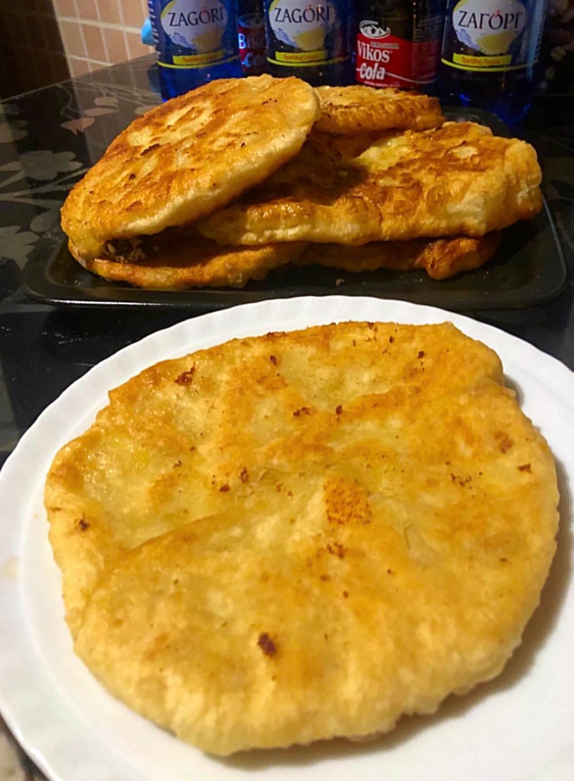 - Βάζουμε στην μέση τρίμματα φέτας, κλείνουμε τις άκρες της ζύμης σαν φακελάκι και με τον πλάστη την πατάμε να ανοίξει σαν λεπτό φύλλο. Όμοια, ετοιμάζουμε και τα υπόλοιπα τηγανόψωμα