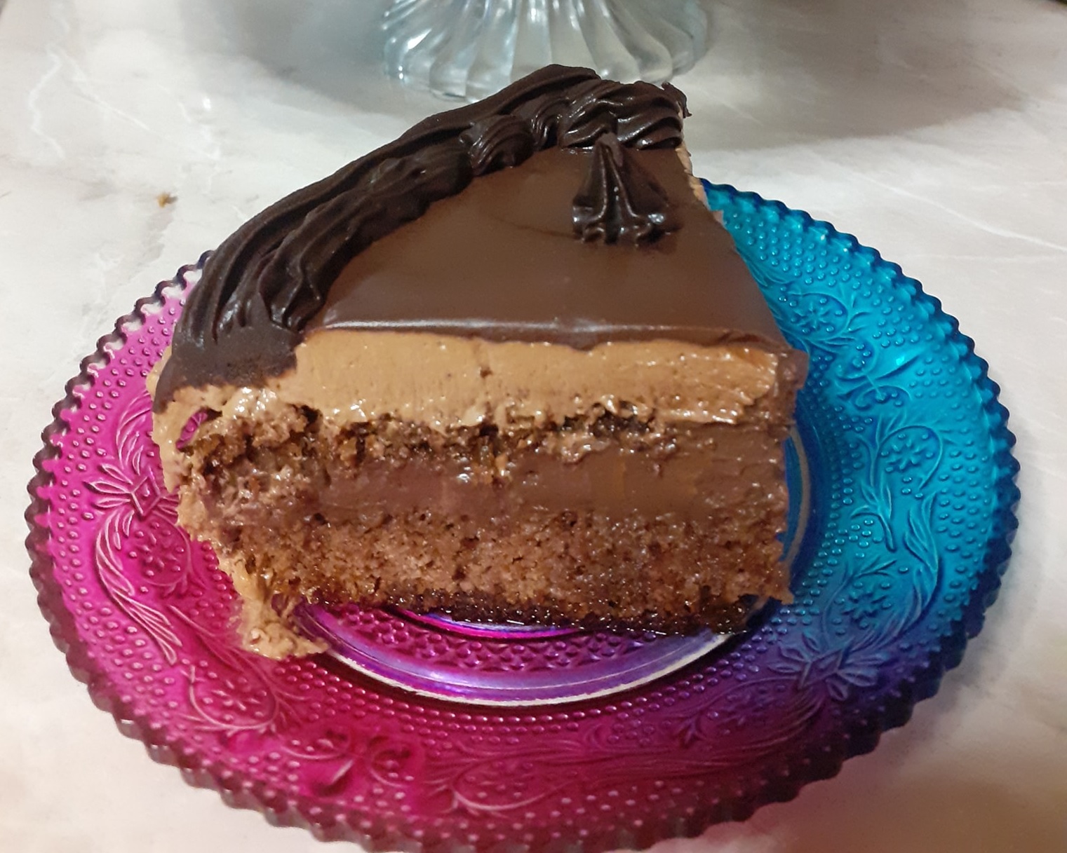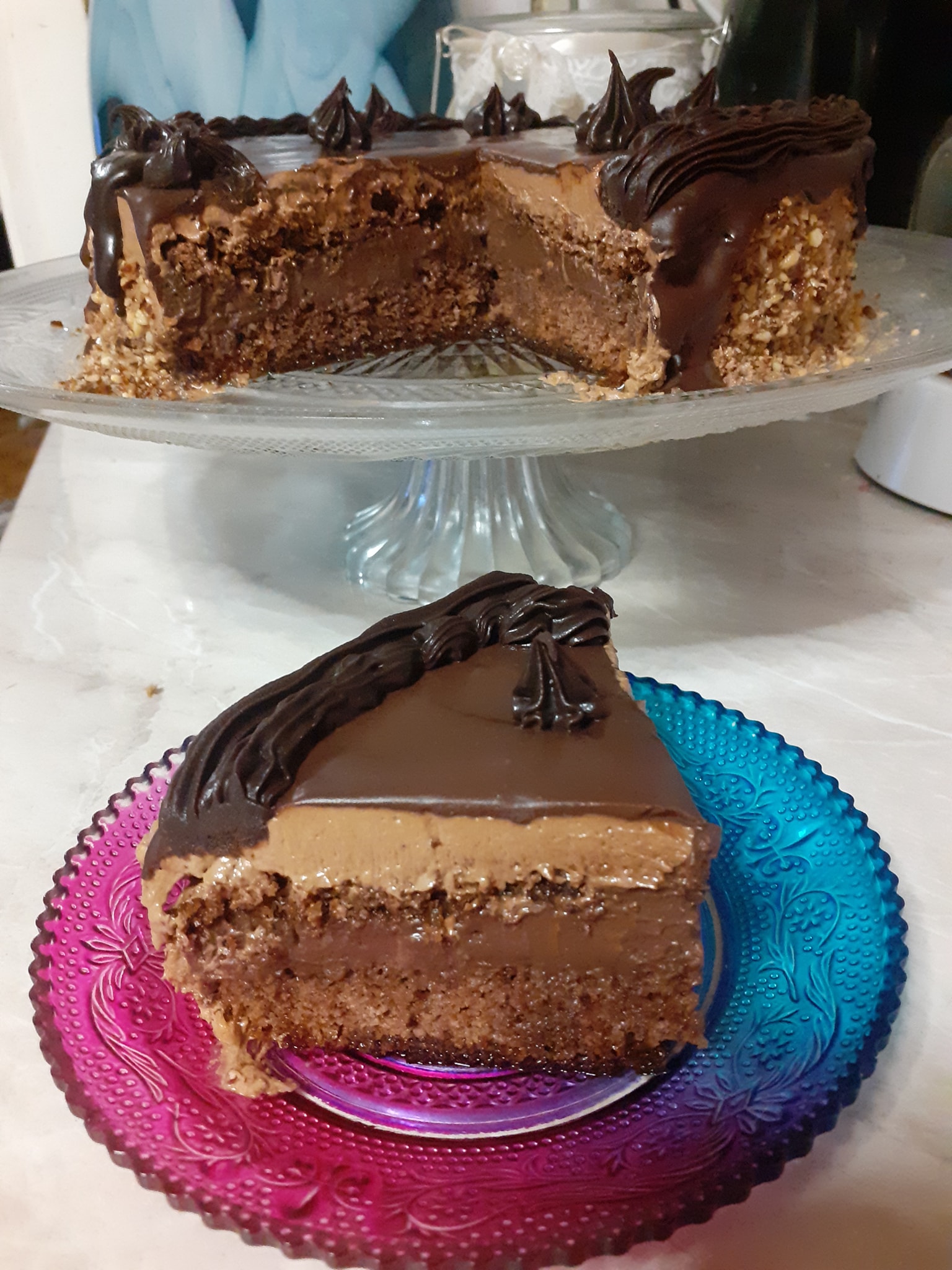 - Για τη γκανάζ σοκολάτας, βάζουμε τα υλικά σε μπεν μαρί να λιώσουν και αφήνουμε να κρυώσει το μείγμα. Στρώνουμε τη γκανάζ από πάνω αλλά και στα πλαϊνά. Προαιρετικά, εγώ στα πλαϊνά βάζω και τριμμένα καραμελωμένα αμύγδαλα