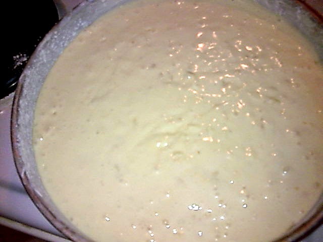- Προσθέτουμε το ζωμό από το μαχλέπι, το υπόλοιπο μαχλέπι, τη μαστίχα, το γάλα, τα αυγά ελαφρά χτυπημένα, το βούτυρο λιωμένο και ζεστό (όχι καυτό), τη ζάχαρη και ανακατεύουμε καλά με το χέρι μας